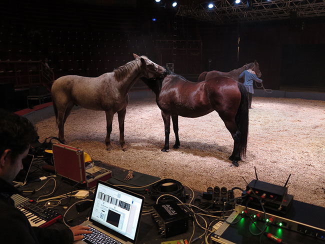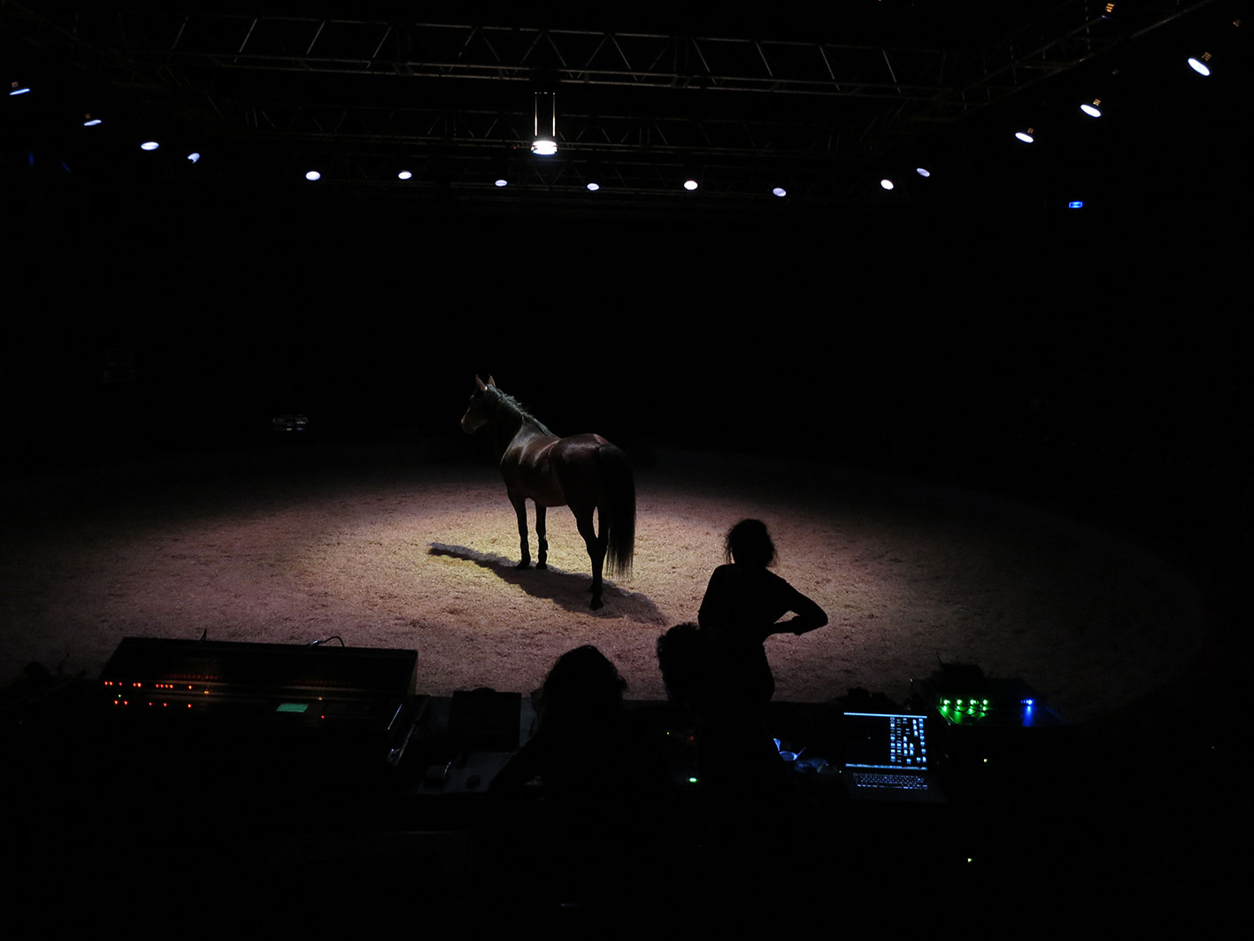 Mes expérimentations s’inscrivaient jusque-là dans des galeries, des parkings et des zones urbaines, sans point de vue unique. En tenant compte de ces nouvelles contraintes et usages, j’ai mis en place un dispositif immersif donnant l’illusion d’un espace hors cadre. Dans cet immense volume où tout circule [l’air, le son, la lumière], j’ai expérimenté toutes sortes de stimuli. Désirant travailler sur la notion de troupeau, j’avais amené non pas un mais trois chevaux. Par moment l’architecture du cirque comme celle de mes trois partenaires devenaient les supports de projection vidéo. En créant des spatialisations sonores, je pouvais suspendre le temps ou induire leur déplacement. Avec un système de capteurs fixés sur lui traduisant le mouvement en son, le cheval générait ses propres rythmes ou ses propres stimuli. J’ai ensuite présenté ces expérimentations sous forme de séquences afin de faire vivre aux spectateurs des moments poétiques donnant l’illusion de nature ou de laboratoire jusqu’à des images surréalistes vivantes…