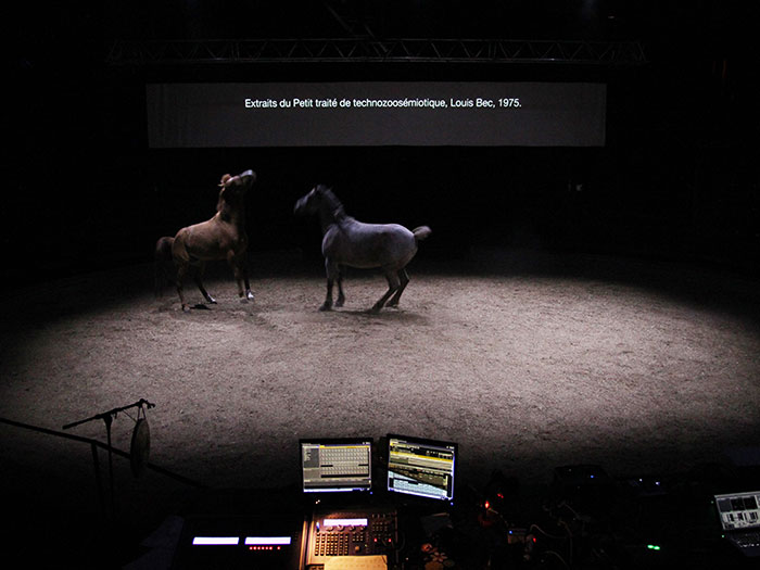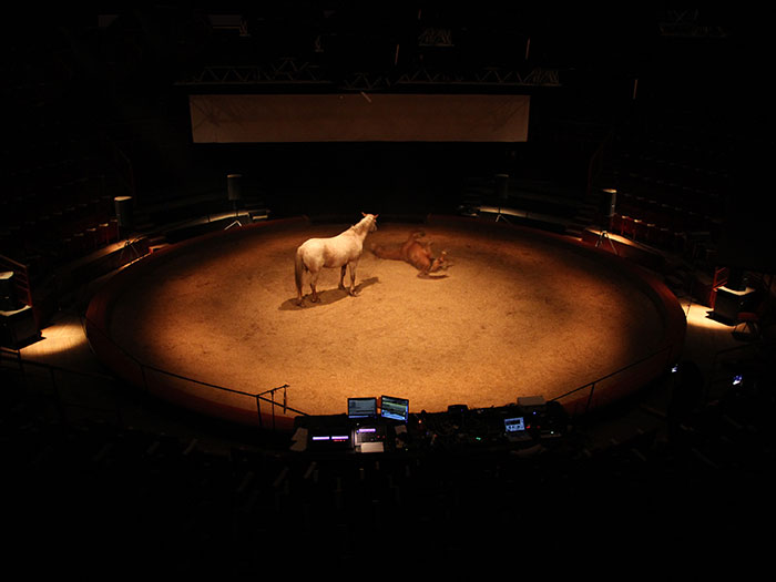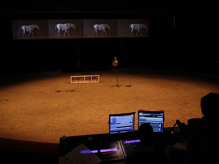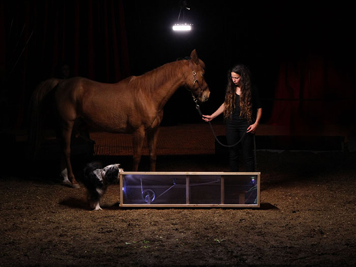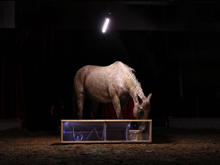 Au coeur de cette réflexion sur les systèmes communicatoires se pose la question du dressage : de cirque et de laboratoire. Comment l’animal répond aux problèmes qui lui sont posés ? Comment les facultés des animaux sont-elles étudiées et interprétées dans les laboratoires ? Et si on les avait dressés autrement ? La recherche qui se joue sur scène propose un dispositif inspiré de protocoles scientifiques qui permettrait de laisser place à la puissance d’agir du cheval sur scène.