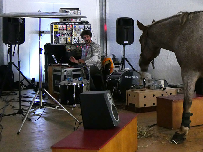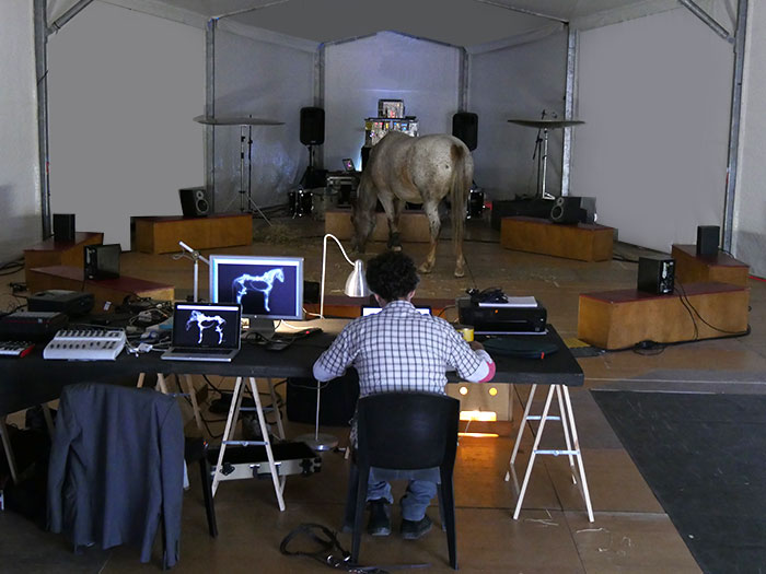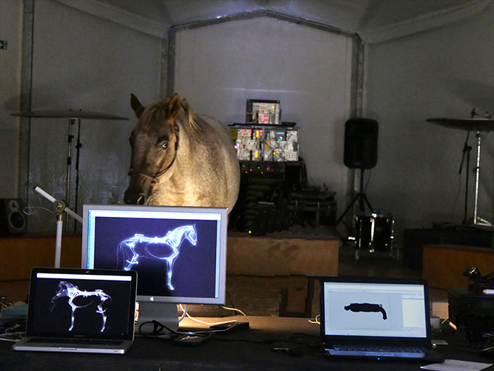 Ce moment de recherche nous a permis de refléchir à la conception d’un dispositif permettant de récupérer et traiter les différentes données biologiques de mes chevaux sur scène. Sous forme de « biosuit », ce dispositif embarqué permet de créer un feedback des réactions du cheval sur scène en lien direct avec son environnement. D’après les différentes publications scientifiques sur l’éthologie cognitive équestre nous avons opéré une sélection des données biologiques du cheval qui semble pertinente pour le cheval sur scène tels que la fréquence cardiaque, position dans l’espace, accéléromètres sur les jambes.